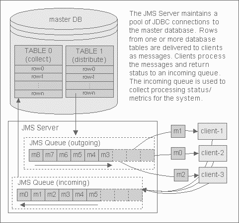 Figure 1 shows a very simple JMS-based system in which an outgoing queue is populated with messages for clients to pick up for processing, as well as an incoming queue, which collects the results of the client processing for insertion into a database.