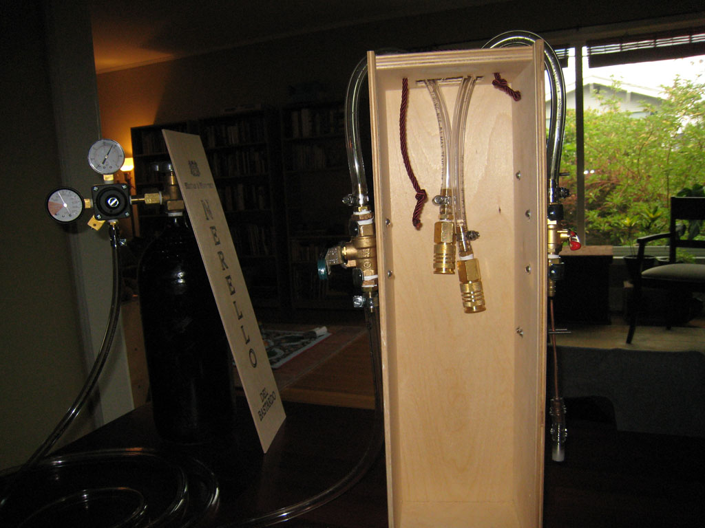 I have to admit the most problematic part of the entire project was cutting a 4" x 2" hole in the top of the wine box for the air couplers to go through.