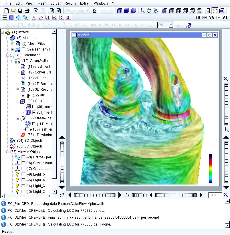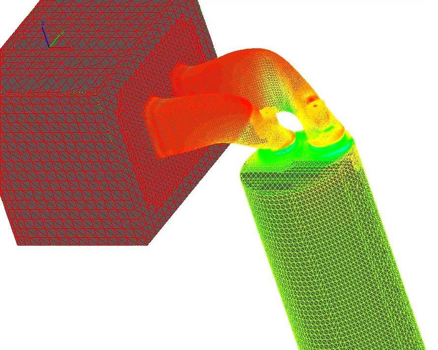 The CFD simulation grid of an intake port. This image illustrates the versatility of a typical, unstructured, CFD simulation grid containing a flow source from the left, two connecting pipes in the middle, two intake ports at the ends of the pipes, and a combustion chamber cylinder on the right. |