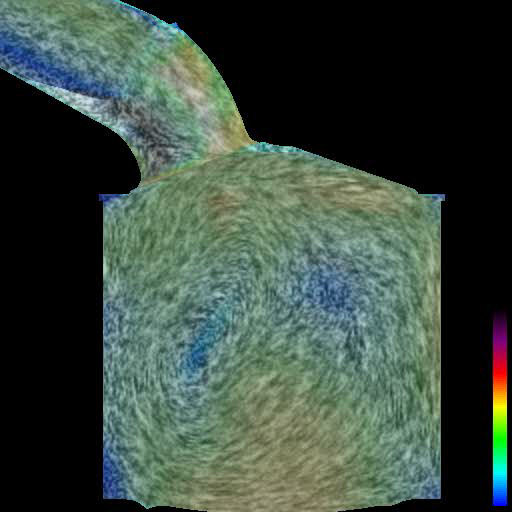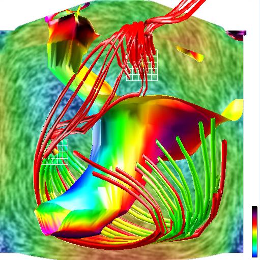 Visualization of tumble motion using a combination of several visualization options including: texture-based flow visualization, isosurfacing, streamlines, and color-mapping. | |||||