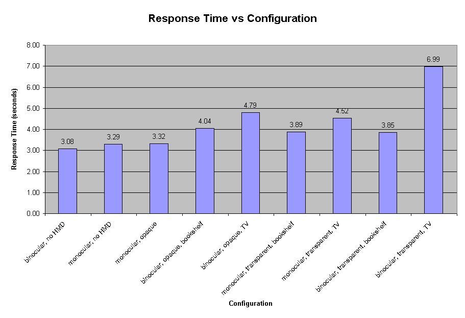 Average response time versus each of 9 HMD configurations. The configurations are labeled with (1) the number of viewing eyes (2) the HMD opacity (or transparency) and (3) the type of background (bookshelf or TV) e.g. binocular, opaque, bookshelf | ||||||