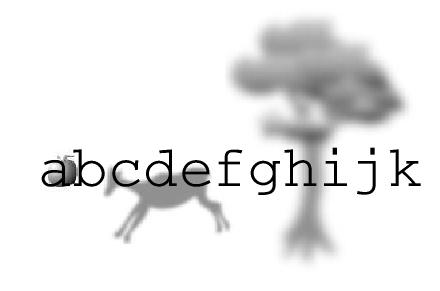 This figure shows text at one focal distance, and background objects at three different simulated focal distances. The fruit which is closer to the focal distance of the text makes the text harder to read whereas the text in front of the tree is easier to read. | ||||||
