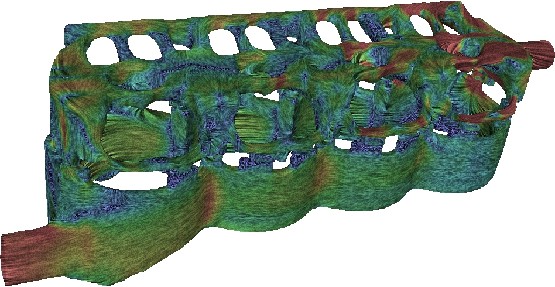 Visualization of flow at the complex boundary surface of a cooling jacket. Color is mapped to velocity magnitude. | ||||||