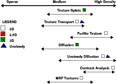 Related dense, texture-based flow visualization methods. Each method is compared with respect to the density of the resulting visualization. | |||||