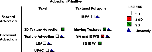 The classification of texture advection and GPU-based techniques. The columns indicate the visual mapping used while the rows indicate the advection scheme. | ||||||