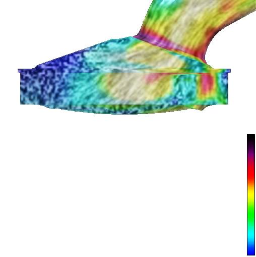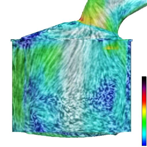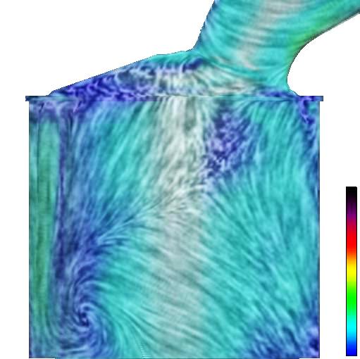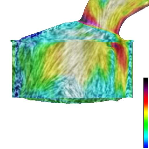 Dye injection is used to highlight areas of the flow in combination with a low-contrast LIC texture. The data set is a slice through an intake port and combustion chamber from CFD. | |||||